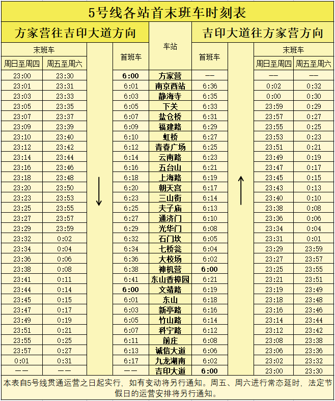 根据南京地铁公布的全线运营方案,自今日6时起,南京地铁5号线工作日早晚高峰采用大、小交路组织行车,大交路为吉印大道——方家营,小交路为科宁路——方家营;其他时段及周末采用吉印大道——方家营单一交路运行。吉印大道往方家营方向于吉印大道站和神机营站设首班车,方家营往吉印大道方向于方家营站和文靖路站设首班车,首班车发车时间维持6:00不变;周日至周四两端末班车发车时间为23:00,周五至周六组织常态化延时,两端末班车发车时间为23:30。南京地铁表示,5号线全线贯通运营后将根据客流情况适时进行运输组织优化调整,不断提升运营服务,保障乘客出行需求。