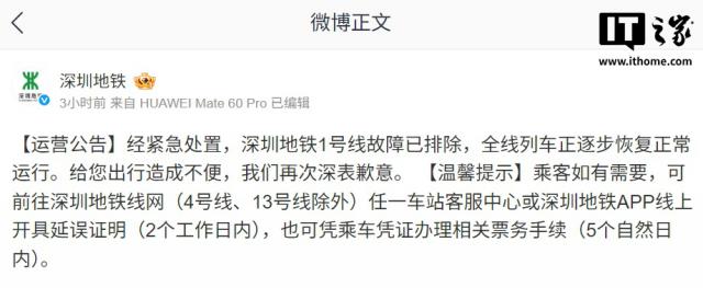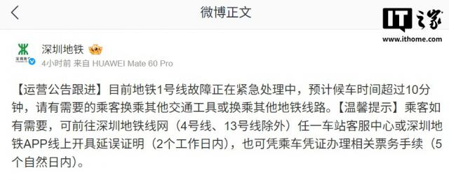 IT 之家从公告获悉,乘客如有需要,可前往深圳地铁线网(4 号线、13 号线除外)任一车站客服中心或深圳地铁 App 线上开具延误证明(2 个工作日内),也可凭乘车凭证办理相关票务手续(5 个自然日内)。