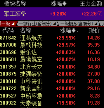 具体来看,军工股全天强势领涨,截至收盘,通易航天、晟楠科技30%涨停,爱乐达、晨曦航空、北方长龙等近10股20%涨停。