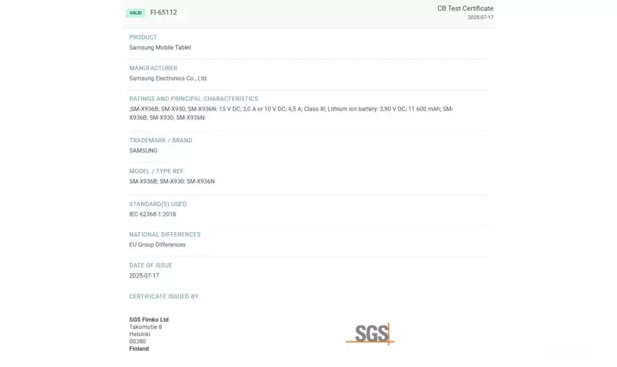 一款型号为SM-X930、SM-X936B和SM-X936N的三星设备在芬兰SGS Fimko认证平台上被曝光。据悉,这些型号与Galaxy Tab S11 Ultra相关联。认证文件显示,该设备配备了一块11600mAh的电池,并支持45W快充。