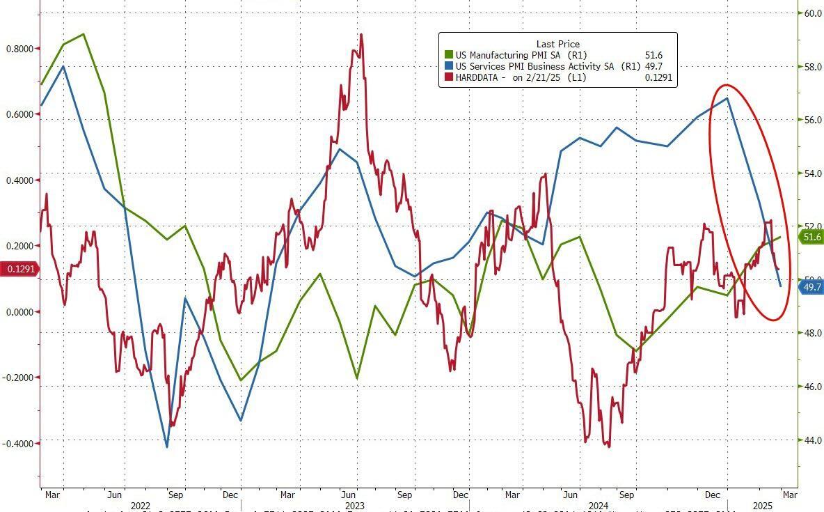 美国2月Markit服务业PMI初值49.7,创2023年1月份以来新低,预期53,前值52.9。其中,就业分项指数初值降至49.3,创2024年11月以来新低;价格收取分项指数初值创2020年5月以来新低;新业务流入几乎陷入停滞,虽然仍在扩张,但扩张幅度为10个月以来的最小。