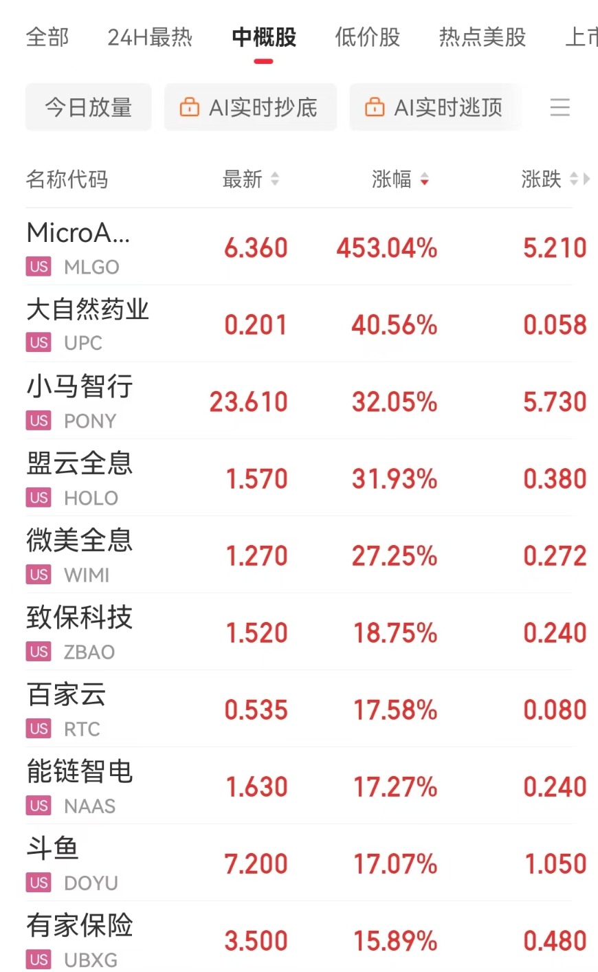 值得注意的是,中概股MicroAlgo MLGO,盘中一度涨超900%,截至收盘涨453.04%,市值6342.7万美元。