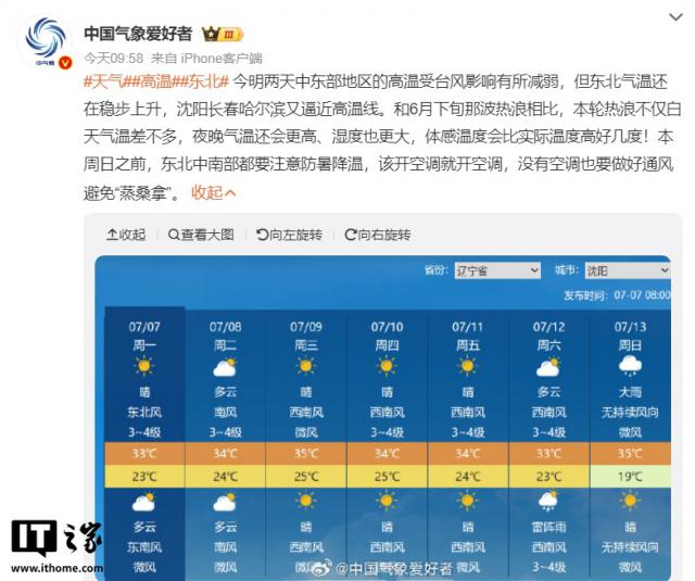 博主 @中国气象爱好者 今日还预警,今明两天中东部地区的高温受台风影响有所减弱,但东北气温还在稳步上升,沈阳长春哈尔滨又逼近高温线。和 6 月下旬那波热浪相比,本轮热浪不仅白天气温差不多,夜晚气温还会更高、湿度也更大,体感温度会比实际温度高好几度!本周日之前,东北中南部都要注意防暑降温,该开空调就开空调,没有空调也要做好通风避免"蒸桑拿"。